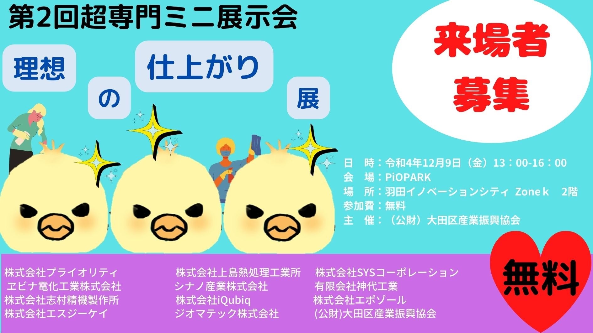 当協会では、前回ご好評いただいた超専門ミニ展示会の第2弾として、「理想の仕上がり展」を12月9日(金)に開催します。素材加工を前工程と後工程に分けて考えた場合に後工程に当たる「仕上げ」に特化した、大田区ならではの展示会。