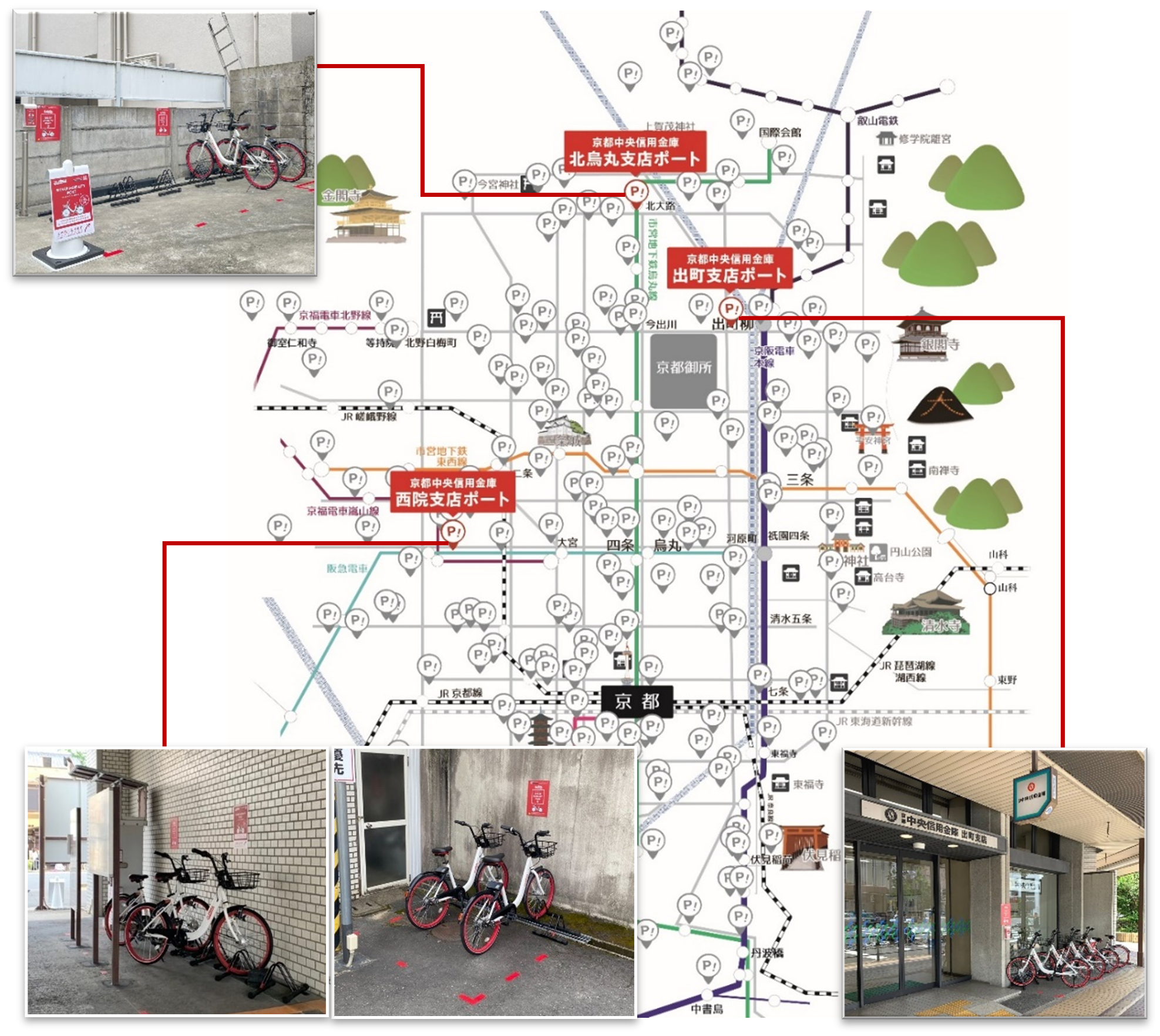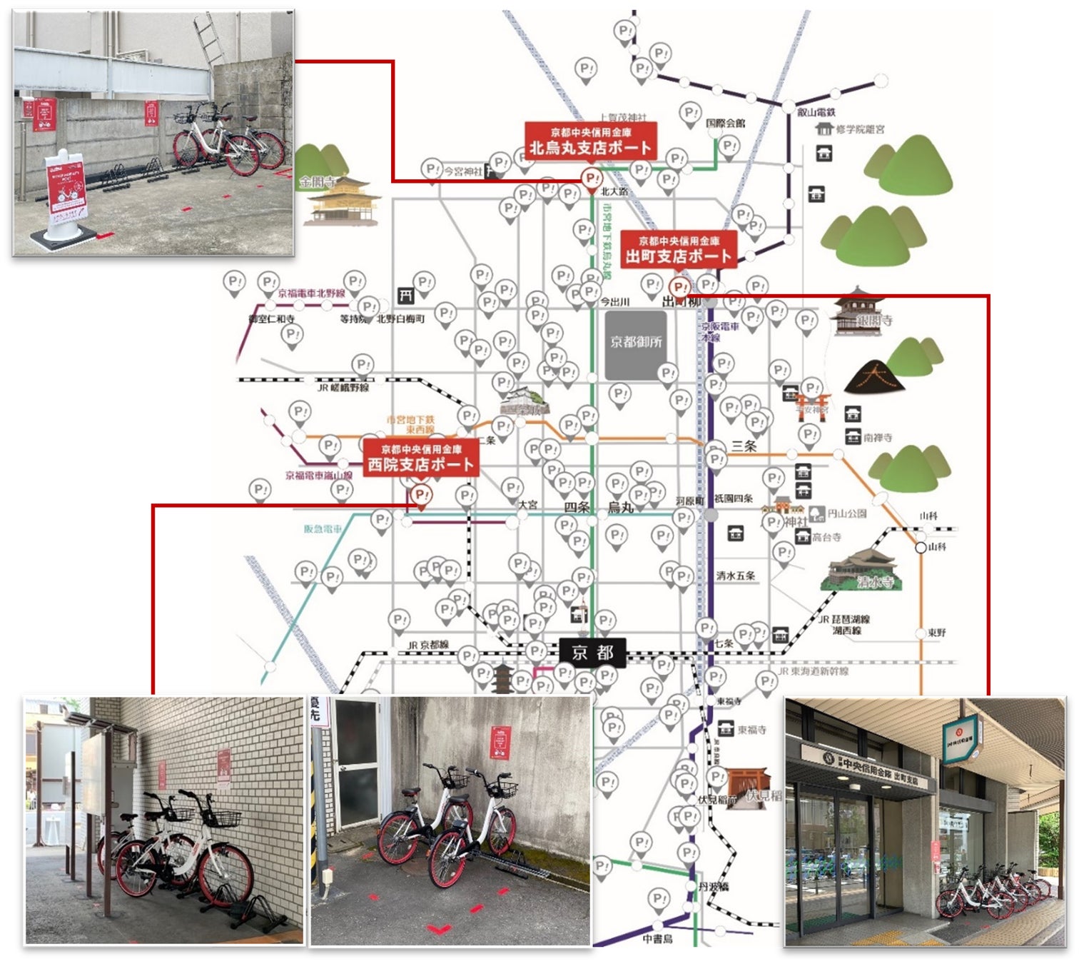 スタートは3支店の遊休スペースなどを活用してシェアサイクル用の駐輪スペース(以下、「ポート」)を導入し、地域住民の利便性を高めます。支店のポートが一つの接点となり、地域の魅力発見や人と人・人と地域が繋がるようなサービスを提供していくことで『行きたくなるまち』から『住みたくなるまち』京都への発展を共に目指し、地域の皆さまのお役に立てるような取り組みを推進していきます。