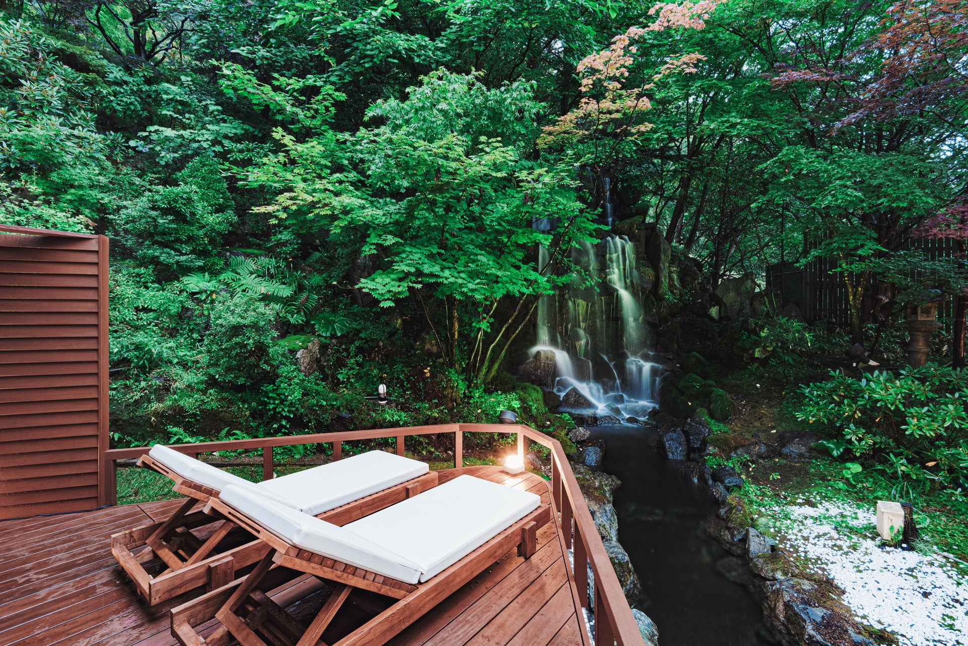 サウナ室の外観には地獄谷の崖のような岩肌を採用し、まるで鬼の棲み家のような荒々しさを表現。室内は木材をベースにした自然になじむ素材で構成され、大きな正面の窓と側面の円形窓が四季折々の風景を美しく切り取ります。サウナストーブは鬼の棍棒を模した金色のフレームに大量のサウナストーンを収容し、「鬼」の名に負けじと110度の高温設定を実現。室外には重厚感のある羽釜風呂を設置し、天然水風呂・湯風呂が青鬼・赤鬼をイメージした2色の湯船で並びます。汗を流した後は滝の目の前で外気浴。山間の澄んだ空気と力強い水流の音で、心身ともに整っていただけます。