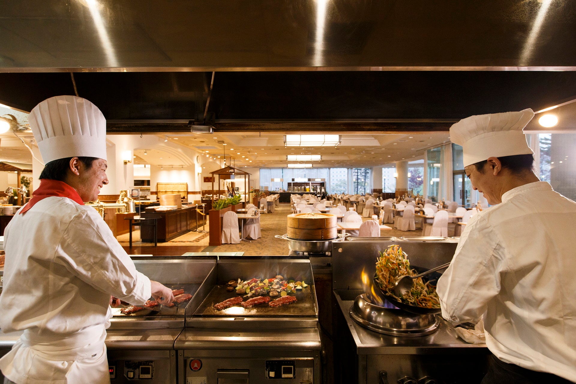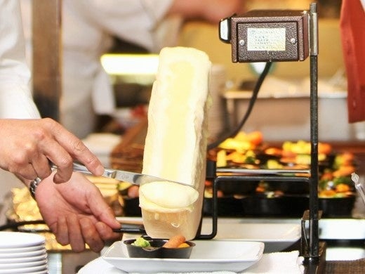 お食事にも力を入れており、和食・洋食・中華・製菓、それぞれの調理人達が工夫を凝らし、北海道ならではの食材を生かしたビュッフェメニューの数々をご用意しております。ディナータイムは、ライブメニューをふんだんに取り入れ、作り立ての美味しさをご提供します。道産チーズをたっぷりと楽しめるラクレットや当ホテル内の工房で作る自家製バームクーヘンが人気です。
