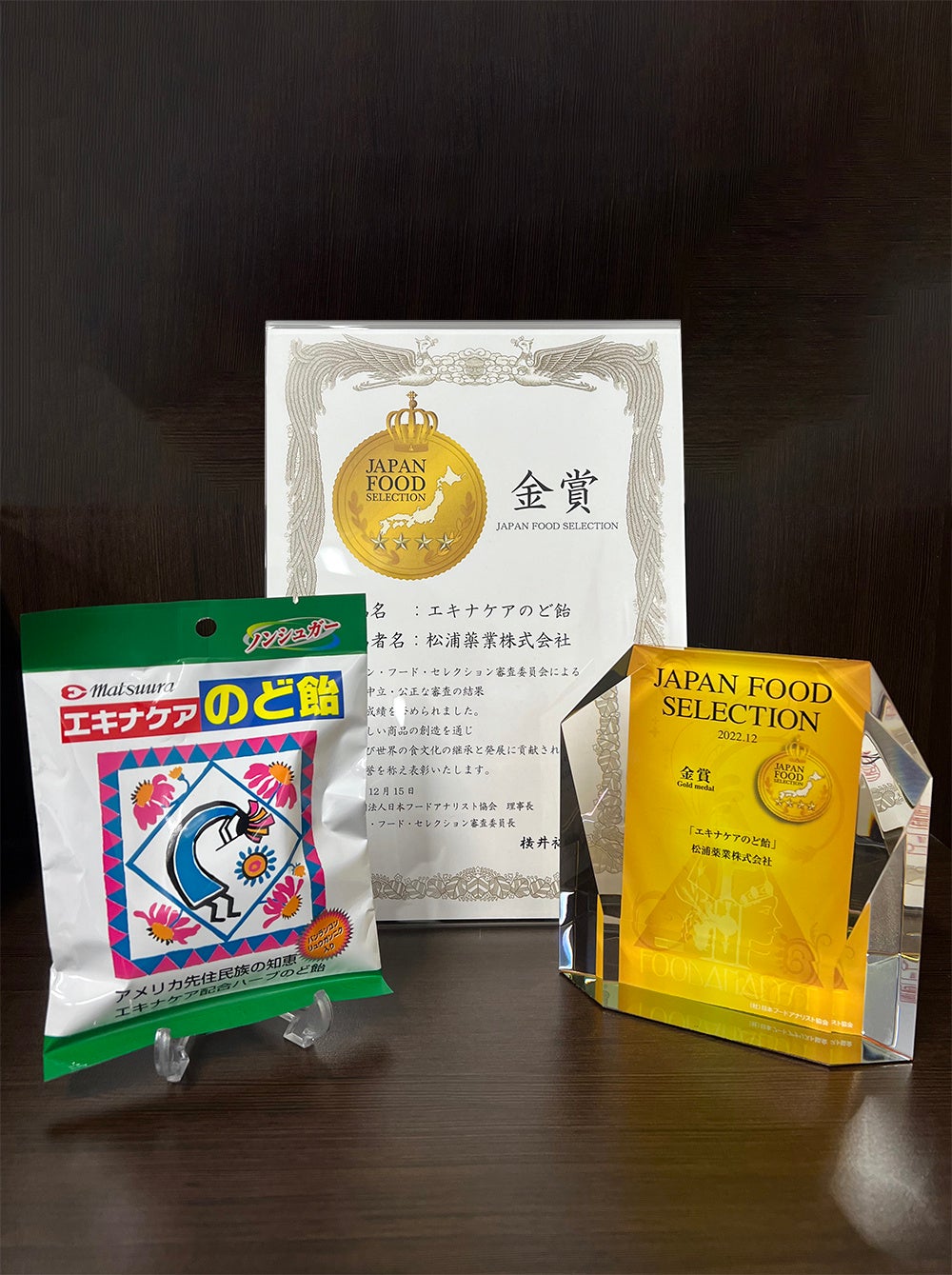 漢方薬および健康食品の企画・製造ならびに販売を手掛ける松浦薬業株式会社(本社営業所:愛知県名古屋市昭和区、代表取締役社長:渡辺知幸)の『エキナケアのど飴』は、一般社団法人日本フードアナリスト協会が主催する「第58回ジャパン・フード・セレクション(2022年12月)」において「金賞」を受賞いたしました。