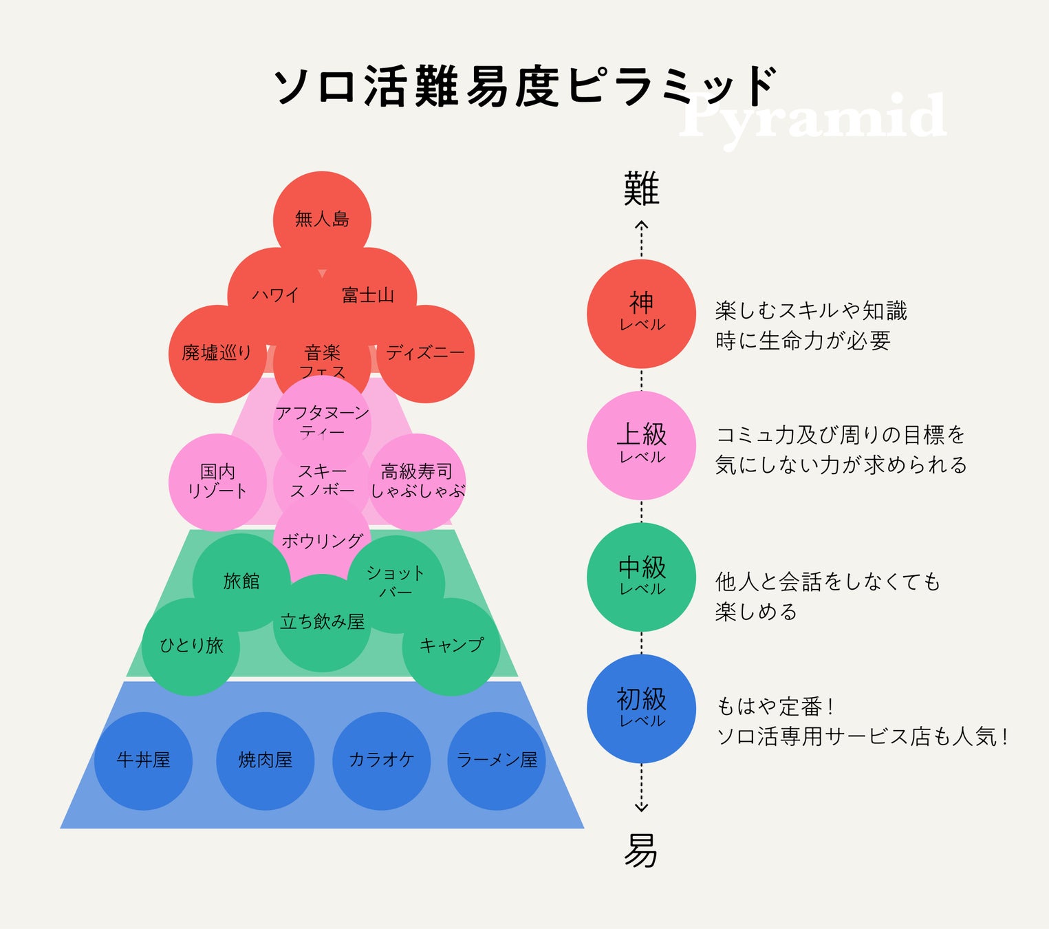 上記の難易度ピラミッドを掲示して具体的な活動レベルを聴取した結果は、「神レベル」で36%と3人に1人以上が経験済み、中級レベルも60%が経験済みであり、回答者の多くがあまり一人で出かけないように思えるお一人様難易度が高い内容を経験しています。