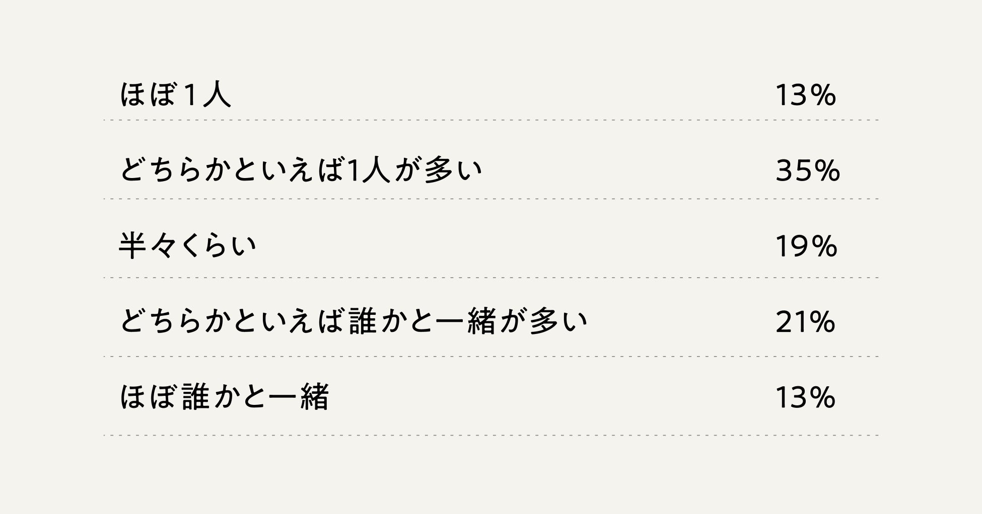Z世代は休日に外出する場合、「ほぼ1人」または「どちらかといえば1人が多い」を選択した方が48%で、約半分の方が1人で過ごすことが多く、一人で出かけるZ世代は多いようです。