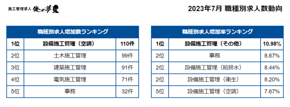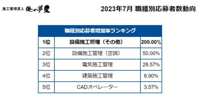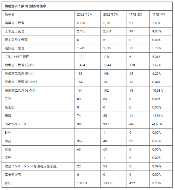 増加率では設備施工管理が、上位5職種のうち4つを占めています。