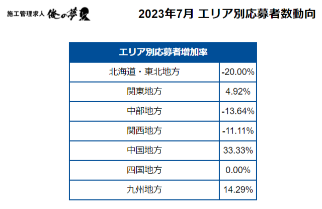 応募者の増加では、職種別では「設備施工管理」系が、エリア別では「中国地方」が特に増加した