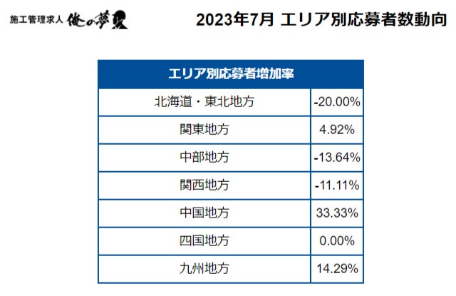 6月と7月の全体の応募者数は同数でしたが、職種別では建築施工管理や電気施工管理、エリア別では中国地方や九州地方など、応募が増えた職種やエリアも見られました。