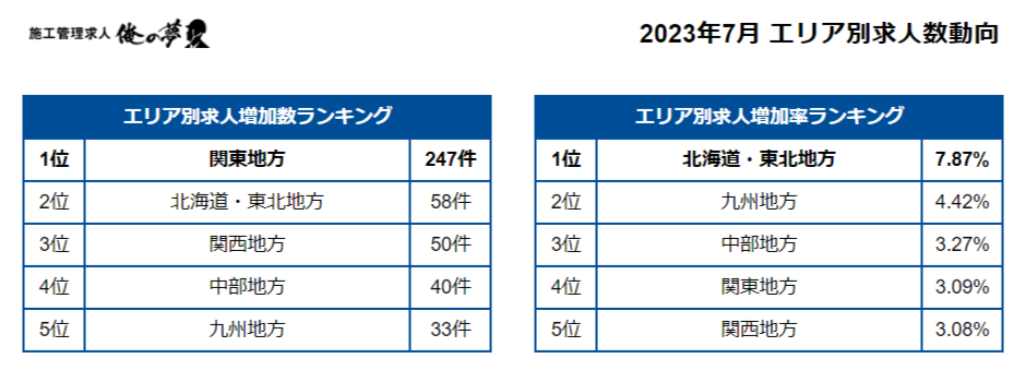 エリア別で求人の増加率が高かったのは「北海道・東北地方」で前月比7.87%増、増加数では「関東地方」で前月比247件増加した