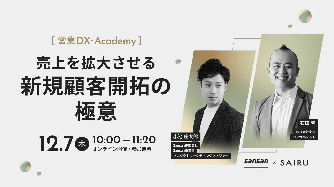 今回、Sansan株式会社と株式会社才流をお迎えして、「最初の10社開拓」をテーマに、営業の新規顧客開拓を成功させるのか解説します。