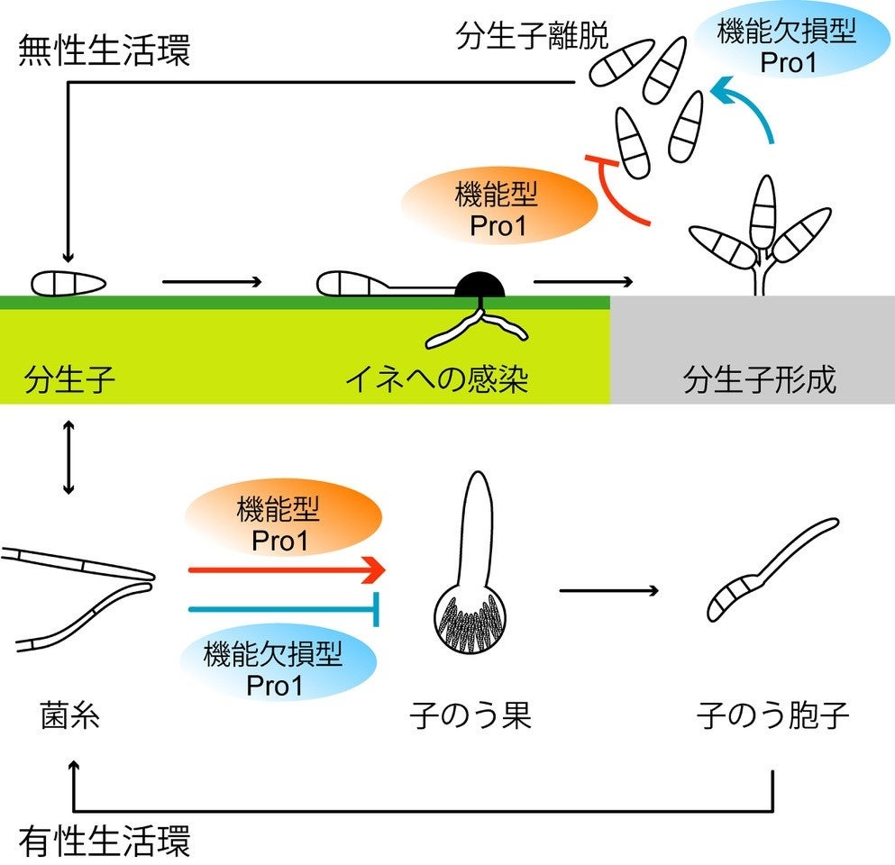図. イネいもち病菌の生活史。Pro1の機能欠損が稔性喪失の原因であることがわかった。