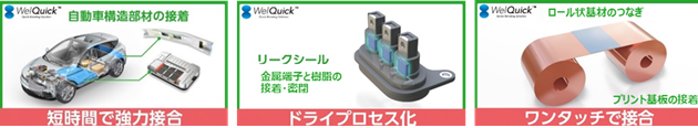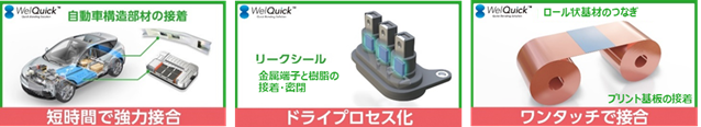用途開発例(自動車構造部材の接着、金属端子と樹脂の接着・密閉、ロール状基板のつなぎ)