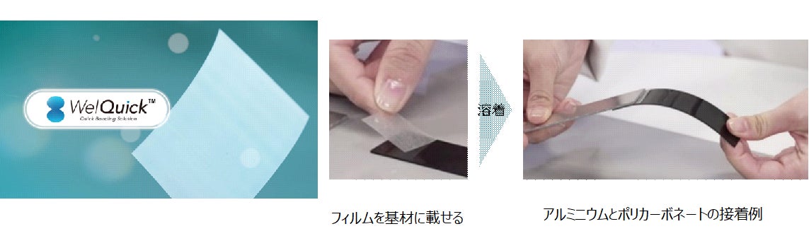 本製品は扱いやすいフィルムという形状で、固体と液体間の相変化*2を利用して接着するため、既存の液状接着剤と比較して取り扱いが簡便です。また、わずか数秒の加熱・加圧で強固に接着できる特徴を持ち、マルチマテリアル化に対応した製品です。従来のボルト・ねじによる接合よりも工数を削減でき、従来の接着剤のように長時間の高温加熱で硬化させる必要もないため生産時間・電力消費量の削減にも寄与、CO2排出量の削減が実現します。