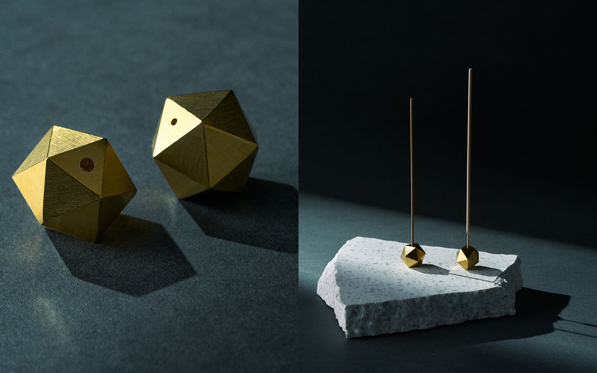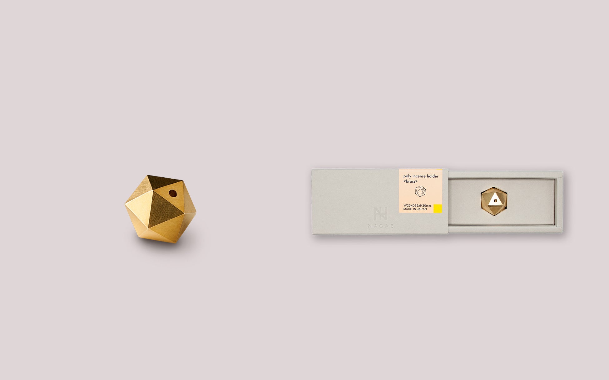 ポリインセンスホルダーブラスは、ダイキャスト鋳造という精度の高い鋳造方法でつくられた真鍮製の香立てです。正二十面体のフォルムにより3種の角度でご使用いただけます。(線香、バンブーインセンスなどスティックタイプのお香にご使用いただけます。)真鍮は、加工性の良さや耐食性の高さなど優れた素材特性から金管楽器や建材、仏具から硬貨など私たちの日常生活でも様々な用途で使われている素材であり、時間の経過とともに表面の酸化等により色合いや風合いが変化する経年変化もたのしむことができます。経年変化をおたのしみいただくため、表面にはコーティングを施していません。燃え切ると数ミリのお香は燃え残りのヤニによって取れにくい場合がありますが、穴に細い貫通穴が空いているため、反対側からピン等で押し出すことで燃え残り部分を簡単に除去することができます。