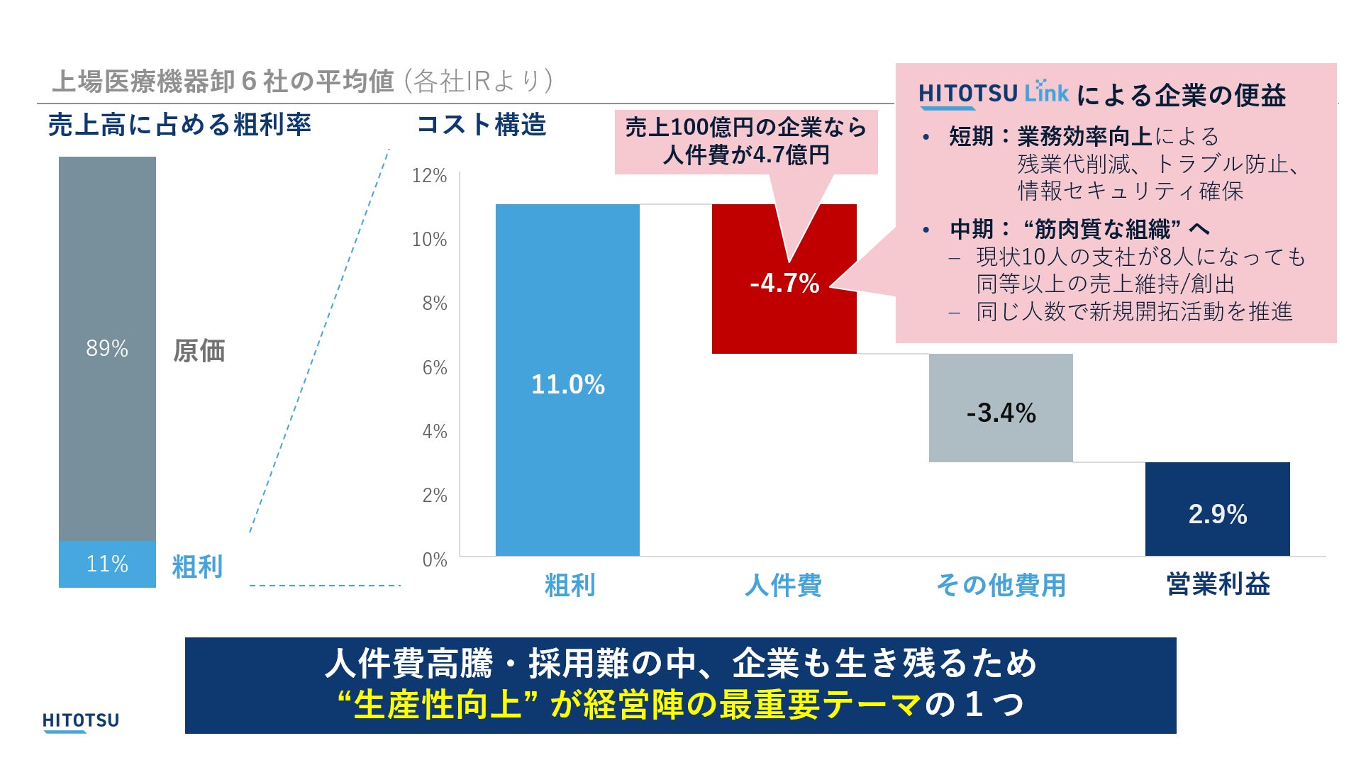 本接続において企業から費用をいただくことに関して、企業への経営負担を増やすと誤解されがちですが、本質はむしろ逆であり、HITOTSU Linkは企業のコスト削減に寄与するプロダクトです。下図に示すように、HITOTSU Linkの導入により、短期的には業務効率向上による残業代や交通費の削減やトラブルの未然防止、中期的には生産性の高い筋肉質な組織への転換を促進します。