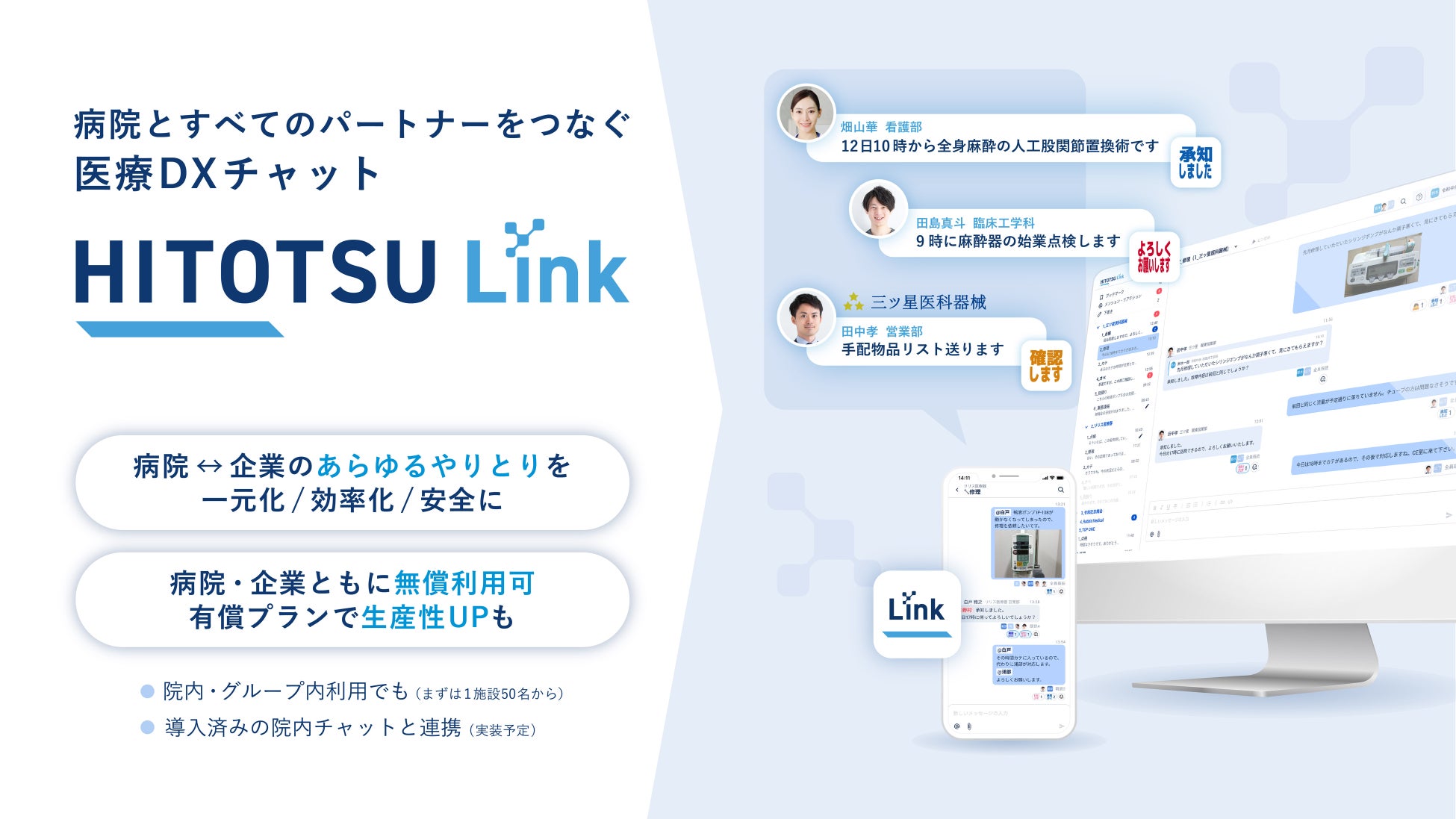 新ブランドコンセプトは「病院とすべてのパートナーをつなぐ医療DXチャットHITOTSU Link」。手術室看護部門や災害地域連携での導入事例も公開中