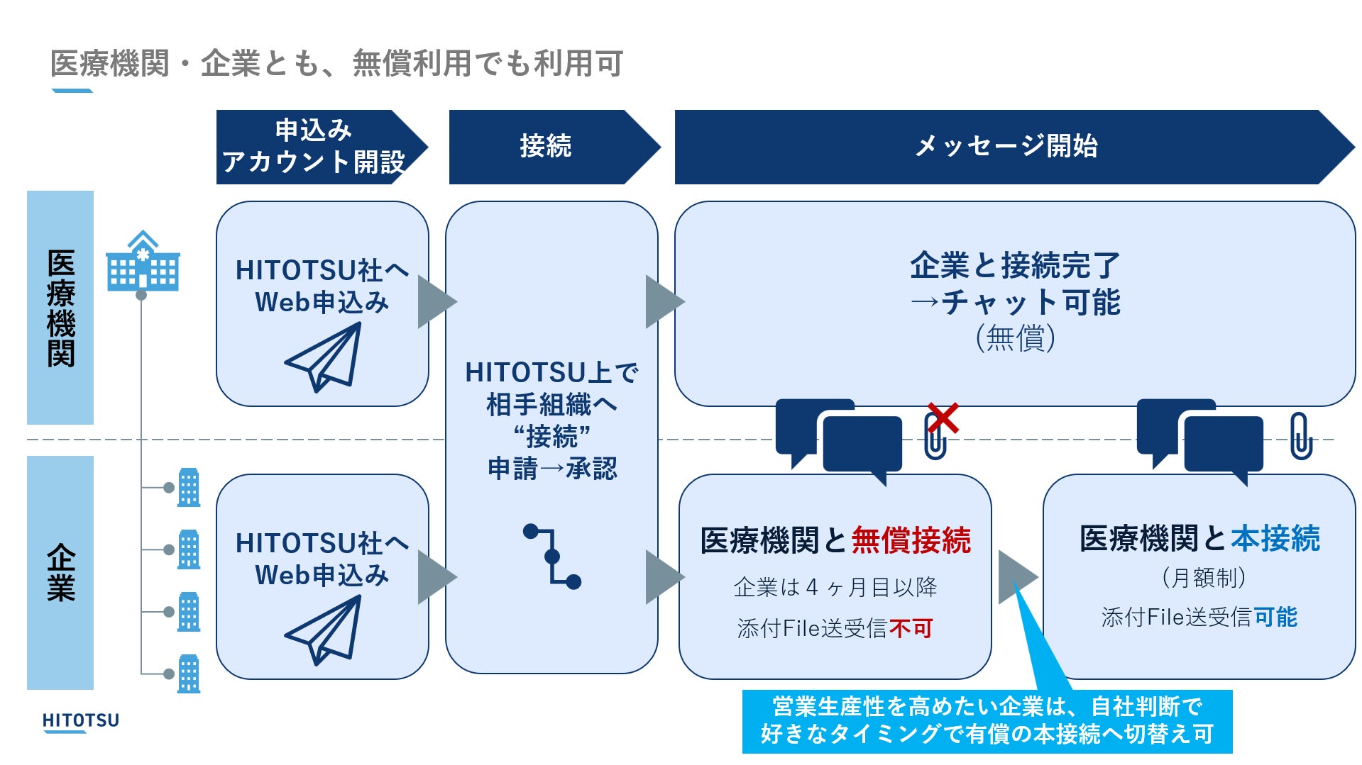 企業自らのご判断で、医療機関と有償(月額制)の本接続をしていただくことで、ファイル送受信も含めてさらなる営業生産性向上を図っていただけます。企業と本接続している医療機関は、本接続ごとにユーザー数上限が20名増えます(このときも、医療機関の費用負担は生じません)。なお、企業は、早いタイミングで本接続に切り替えると、料金が割引になります。