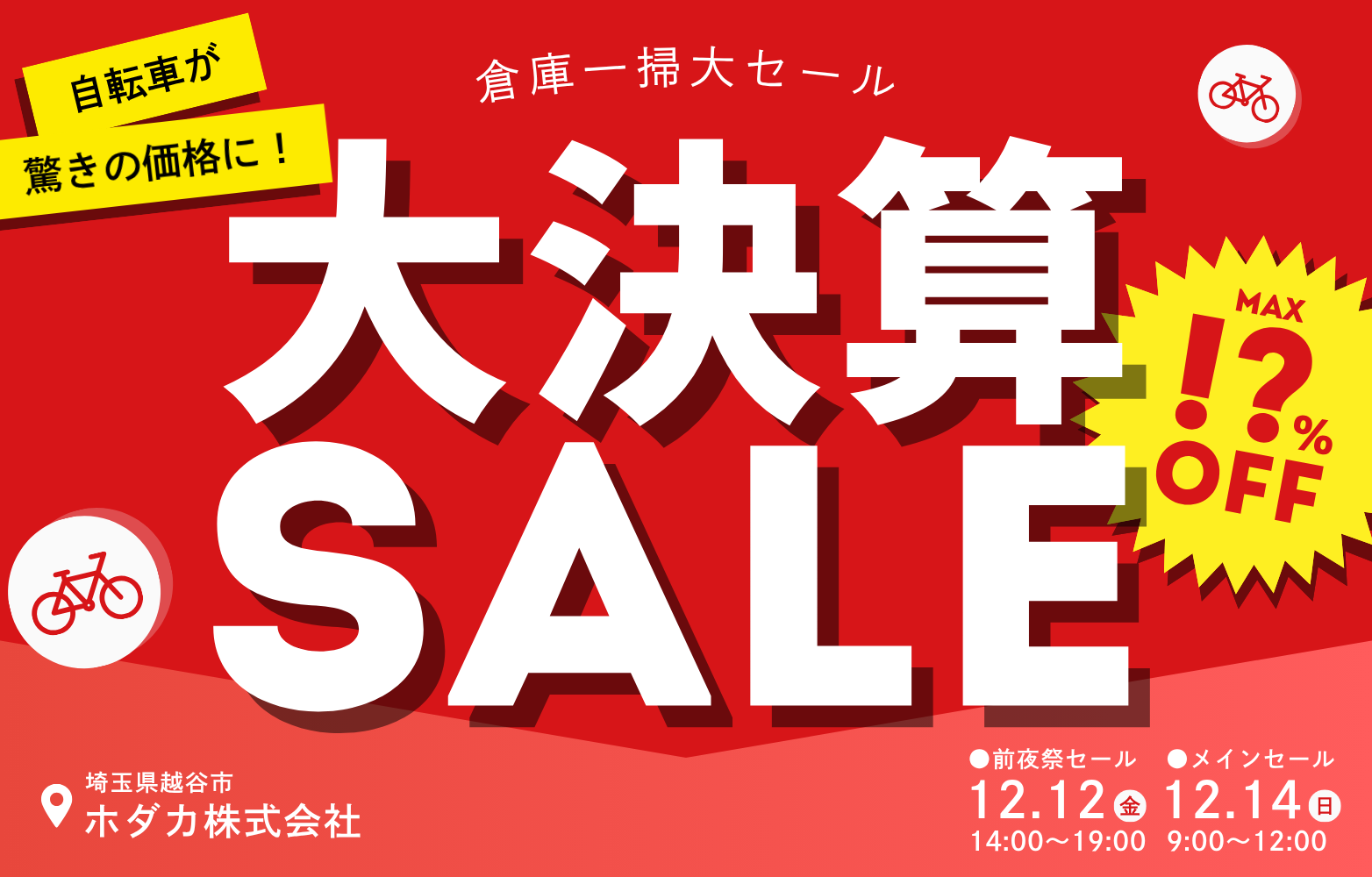 シティサイクルからスポーツ自転車まで幅広く展開する日本の自転車メーカー・ホダカ株式会社(本社:埼玉県越谷市、代表取締役社長:堀田宗男)は、本社にて「倉庫一掃大セール」を開催いたします。