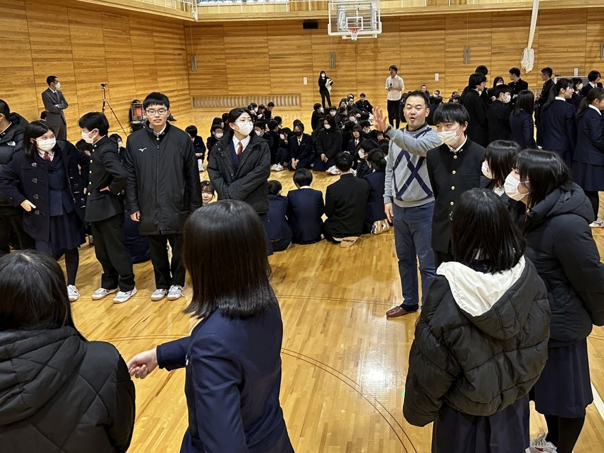 丸紅株式会社電力本部およびグループ会社の社員計17名の方々向けに今年2月に事前研修を実施し、翌月社員の方々を秋田県立秋田南高等学校・中等部に派遣し、「※まるべにせんせい」として人生の体験談をベースとする授業を実施致しました。同校から5限目、6限目の授業枠を頂き前半では丸紅社員と生徒の方々がよりフランクに交流できる為のワークショップを実施しました。