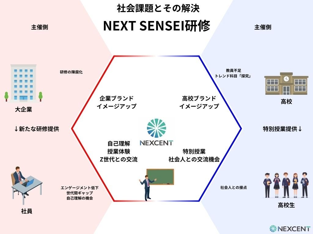 2024年8月26日、株式会社NEXCENT(本社:大阪府大阪市福島区、代表取締役:小澤悠)は、 社会課題解決型の研修プログラム『NEXT SENSEI』の提供を開始します。これまでNEXCENTとして企画・運営してきた中学校・高等学校等の教育機関での探究学習プログラムと大企業向けの企業研修の場を融合した新たなプログラムを開発致しました。学校以外の現場で働く大人が当たり前に教育に携わる社会を形成する為の第一歩として、大企業社員を外部講師として全国の中学校・高等学校に派遣して、人生の体験談をベースとする授業を実施致します。この度、研修導入を希望する企業様、社会人受け入れを希望する学校様を募集致します。