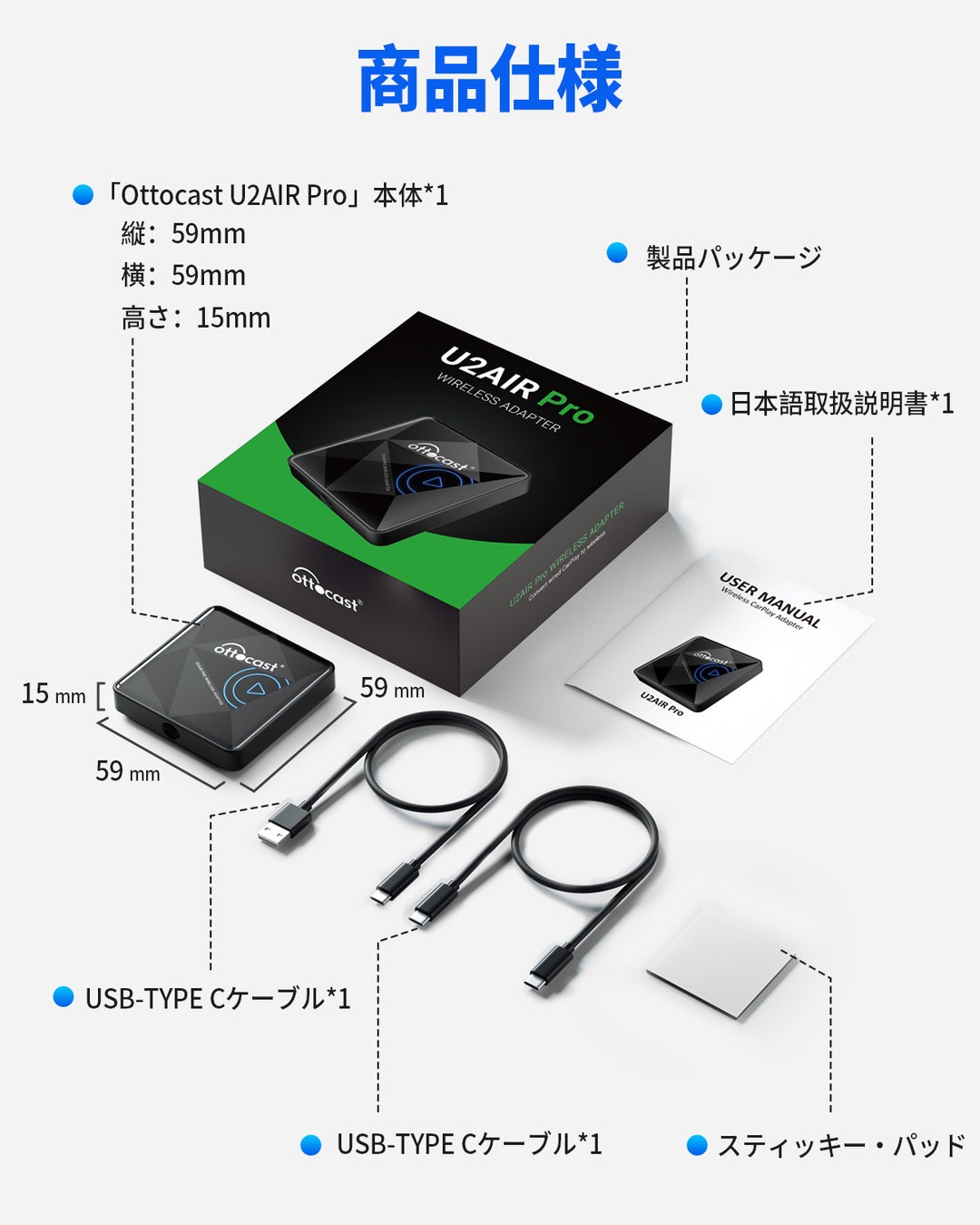 パッケージ内容:ワイヤレスCarplayアダプターU2AIR Pro、USB A to Cケーブル、USB C to Cケーブル、粘着パッド、取扱説明書(日本語あり)
