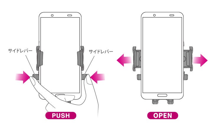 【取外し時】左右のサイドレバーを押すとサイドアームが開き、スマホを取外すことが出来ます。