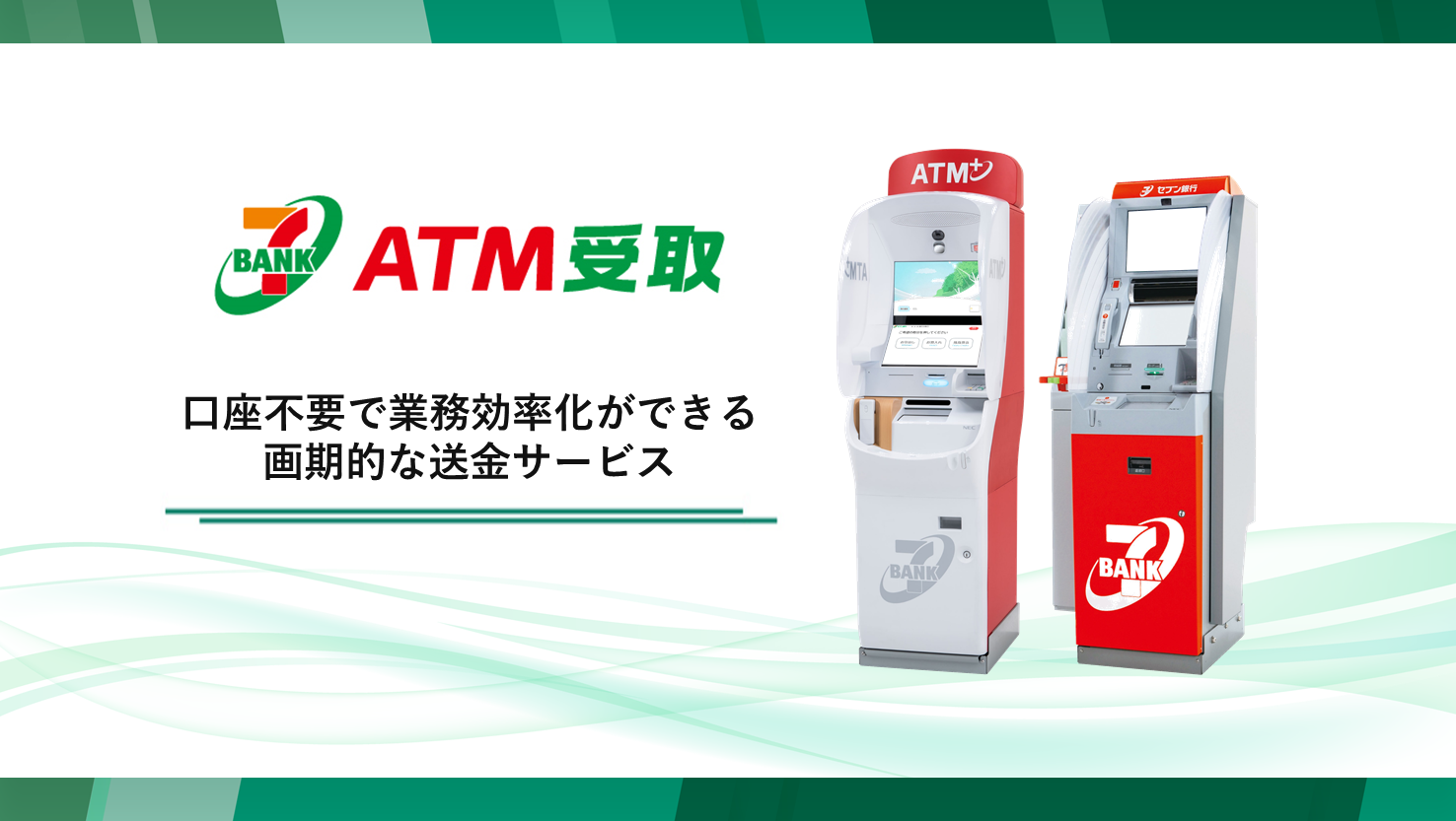 ATM受取は、企業から個人への送金を、全国のセブン銀行ATMにて、銀行口座を介さず現金または電子マネーとして受取ることができるサービスです。働き方の多様化や情報管理の厳格化、キャッシュレス化が進む中、より簡単・便利に、かつ安全にご利用いただける送金サービスとしてご提供しております。