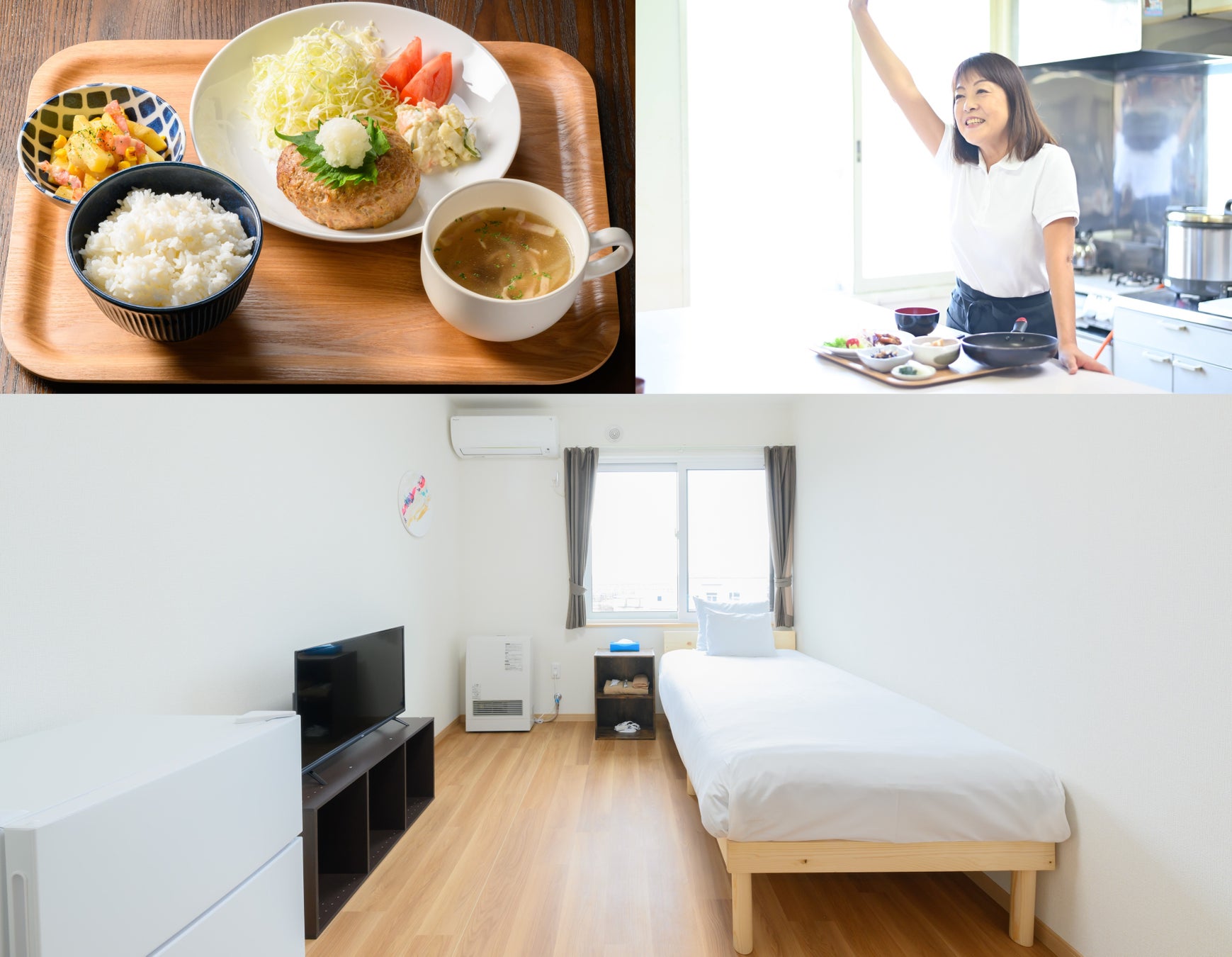 シェフの次に料理上手なシュフ(主婦)のまごころこめた手作りです。夕食メニューは長期滞在でも飽きの来ない日替わりで、栄養バランスばっちり・ボリュームたっぷりの家庭料理を意識しています。朝食は軽く食べたい方からしっかり食べたい方までご満足いただけるよう、特製豚汁とバイキング形式の出汁茶漬け、うどんなどを提供しています。早朝からお仕事がある工事事業者の皆様にも落ち着いて朝食をお召し上がりいただけるよう、朝6時から朝食を提供しています。また、素泊まりの方、お食事付きの方問わず、朝にお一人様1つ塩おむすびを無料提供しており好評を頂いております。