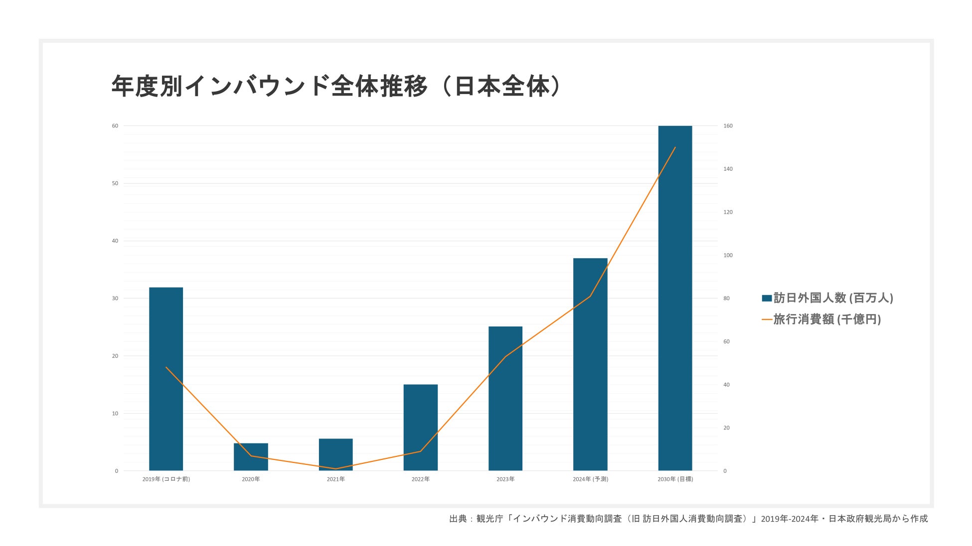 •日本政府の目標では、2030年までに6,000万人の訪日客と15兆円の旅行消費を見込んでおり、インバウンド市場の再興が期待されています。