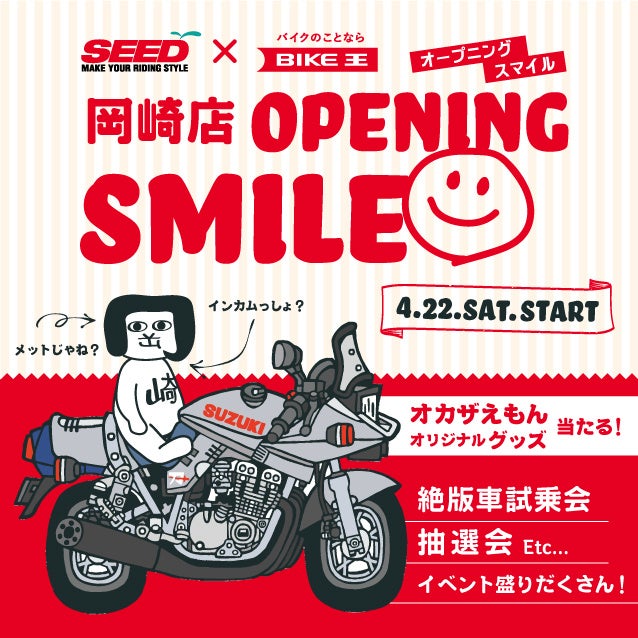 4月22日(土)23日(日)は、オープニングキャンペーンとして「OPENING SMILE」を開催いたします。ご来場いただいた方どなたでも参加可能な抽選会では、地元の岡崎市を代表するキャラクター「オカザえもん」をデザインした当キャンペーン限定グッズが当たります。また、絶版車試乗会などを開催いたしますので、この機会にぜひご来場ください。