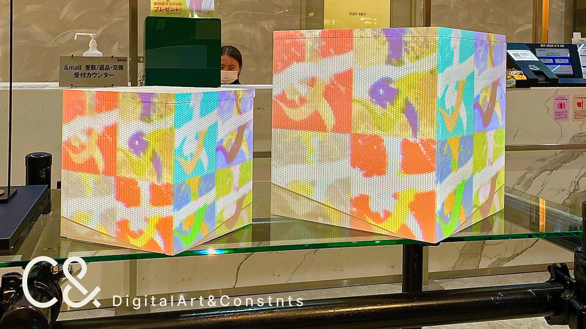 箱を大きくすれば、人が座ったりフォトスポットにも大変身。映像が動き続けることによって、飽きないデザインとなっている。