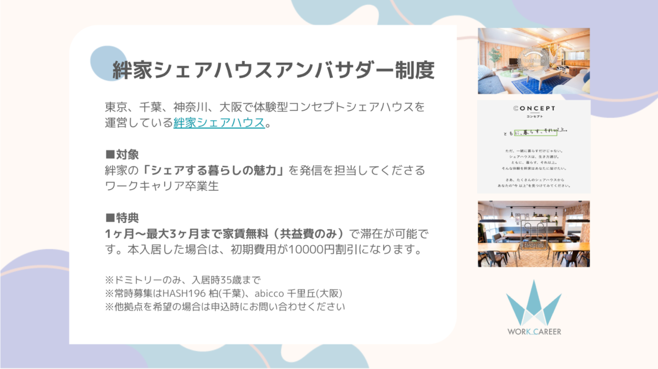 最大90日家賃無料「共同生活×学びの場」で新しいキャリア支援をスタートします。株式会社ワークキャリア × 絆家シェアハウスが連携開始。