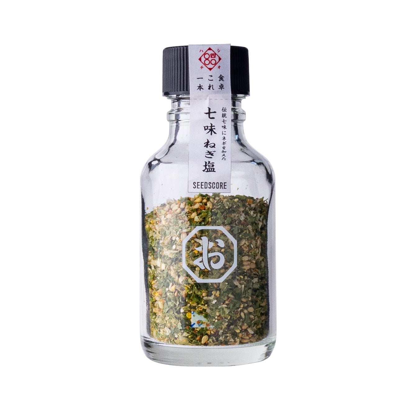伝統七味に乾燥ねぎを加えてブレンドした塩。うどんやそばの風味足しにふりかけて、天ぷらや焼き鳥の付け塩として。煮物や炒め物にも