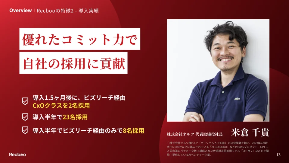 これまでビジネスサイドのキーマンはなかなか採用できておりませんでしたが、今回Recbooを活用したことでビズリーチの運用が改善され、3ヶ月という短期間でCOO候補の採用に至りました。