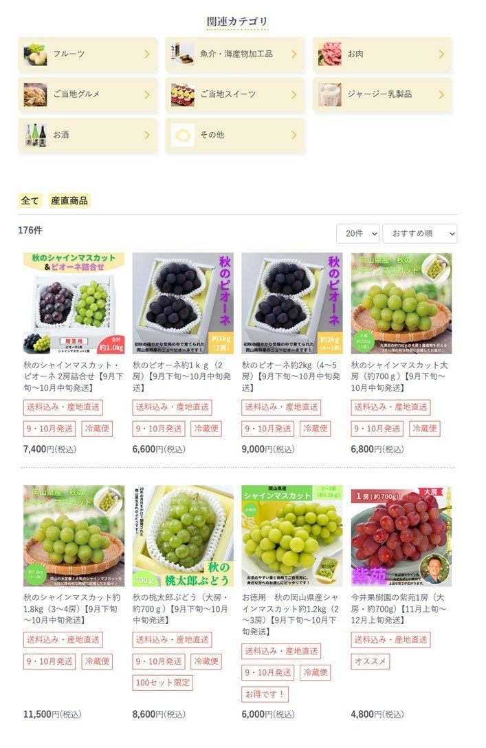 ・対象商品:岡山県産のフルーツ、和菓子、和牛、地酒、デニム雑貨、伝統的工芸品など