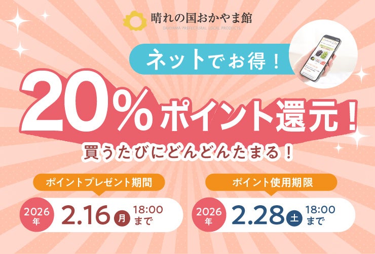 岡山県の魅力ある特産品や工芸品を販売する「晴れの国おかやま館」(運営:公益社団法人岡山県観光連盟/会長 石井 清裕)では、長期化する物価高騰対策として、県産品の消費を喚起し、県内事業者を支援するため、2025年10月10日(金)から2026年2月28日(土)まで、購入金額の最大20%を還元する『おかやま応援キャンペーン』を開催します。物価上昇が続く今、岡山自慢の“いいもの”をお得に体験していただく期間限定の企画です。