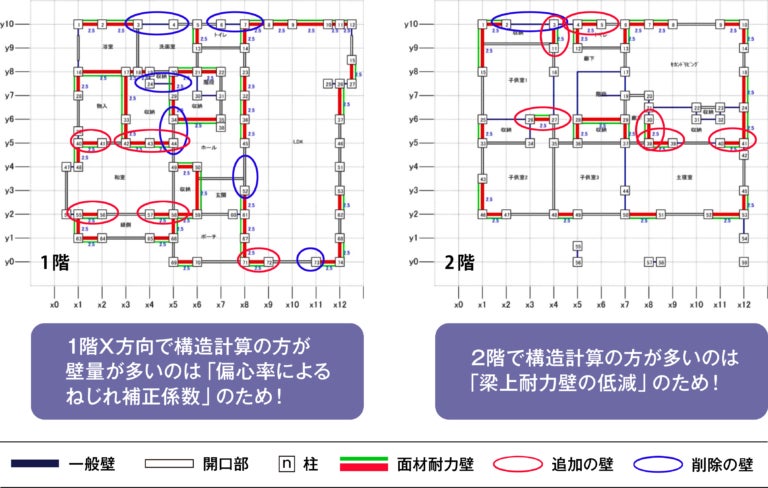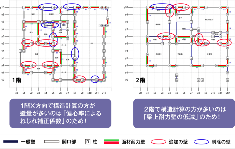 尚、検証結果において建築基準法における存在壁量と品確法の耐震等級1における壁量計算の存在壁量には差異が見られます。これは必要壁量算定において、住宅性能表示制度における壁量計算用床面積は、建築基準法に規定された床面積に、1 階では2 階のオーバーハング面積と玄関ポーチ面積、バルコニー面積の40%を、2 階では吹抜け面積を加えた値となる為です。