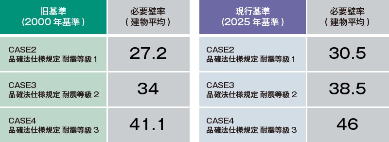 旧基準(2000年基準)は「軽い屋根」、現行基準(2025年基準)は「新壁量表計算ツール(多機能版)」での壁量係数の算定を行い、旧基準と比較すると現行基準は、平均で1.41倍となりました。