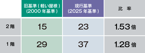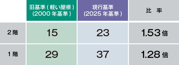 品確法仕様規定で旧基準(2000年基準)と現行基準(2025年基準)を比較すると、耐震等級1では、30.5÷27.2=1.12倍、耐震等級2では、38.5÷34=1.13、耐震等級3では、46÷41.1=1.12と、平均で1.12倍となりました。