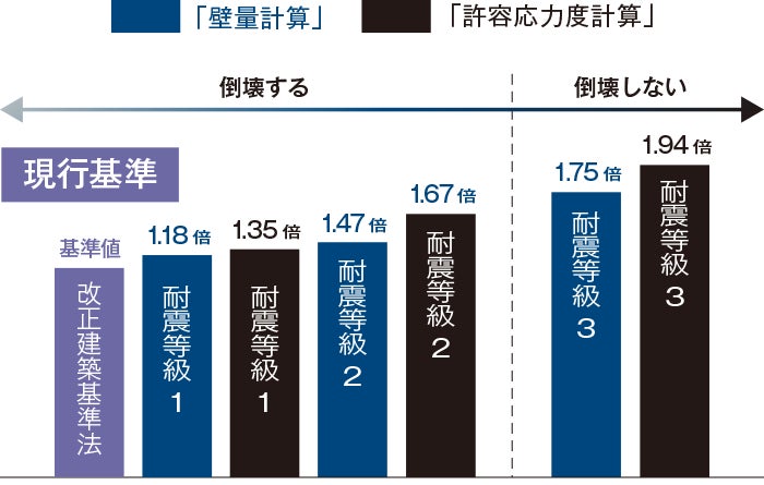 同じ耐震等級であっても、簡易的な「壁量計算」よりも詳細な「許容応力度計算」を行った場合の方が、実質的な壁量(存在壁量)が多くなる傾向が見られました。 「許容応力度計算」では梁上の耐力壁の低減やねじれ補正などを厳密に考慮するため、より安全側の設計となり、建物の安全性確保において優位性があることが示唆されました。