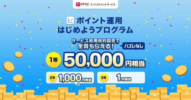 PPSCインベストメントサービス株式会社※1(東京都千代田区、代表取締役:関口 幸哉)は、2月15日から開催される「超PayPay祭(ちょうペイペイまつり)」にあわせて、キャッシュレス決済サービス「PayPay」内のミニアプリ※2PayPayポイント運用」(以下「ポイント運用」)で、初めてポイント運用する方を対象とした「ポイント運用使ってみようキャンペーン」を、2月20日に開始します。