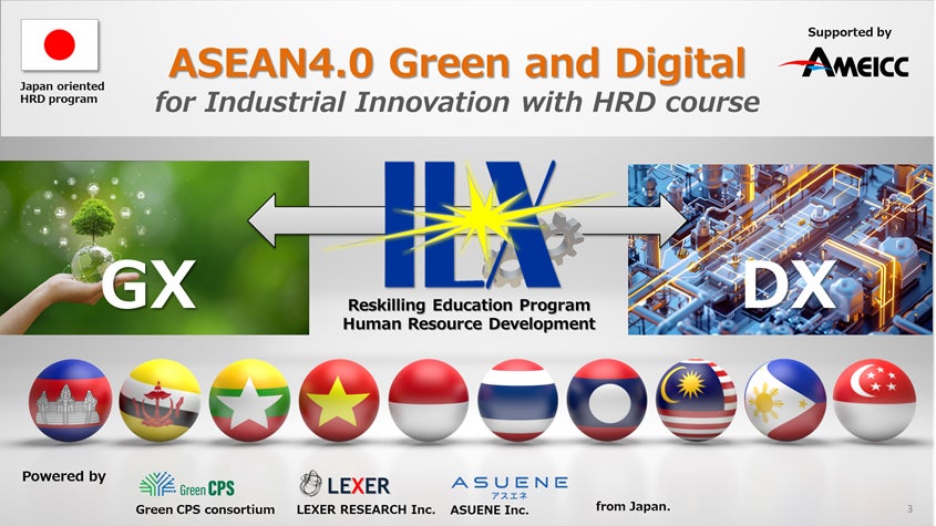 この連携の第1弾として、レクサー・リサーチが推進するILX(製造業向けDX/GX人材育成講座)にアスエネがパートナとして参加し、共同してASEAN地域での人材育成活動を展開します。また、当該事業はILXのASEAN現地パートナー(タマサート大学:タイ、IJBNET:インドネシア)がAMEICC(日アセアン経済産業協力委員会)の進めるASEAN人材育成事業に採択されました。AMEICCの支援を受けてタイ、インドネシアにおいて本年度は7講座を共同して実施する予定です。