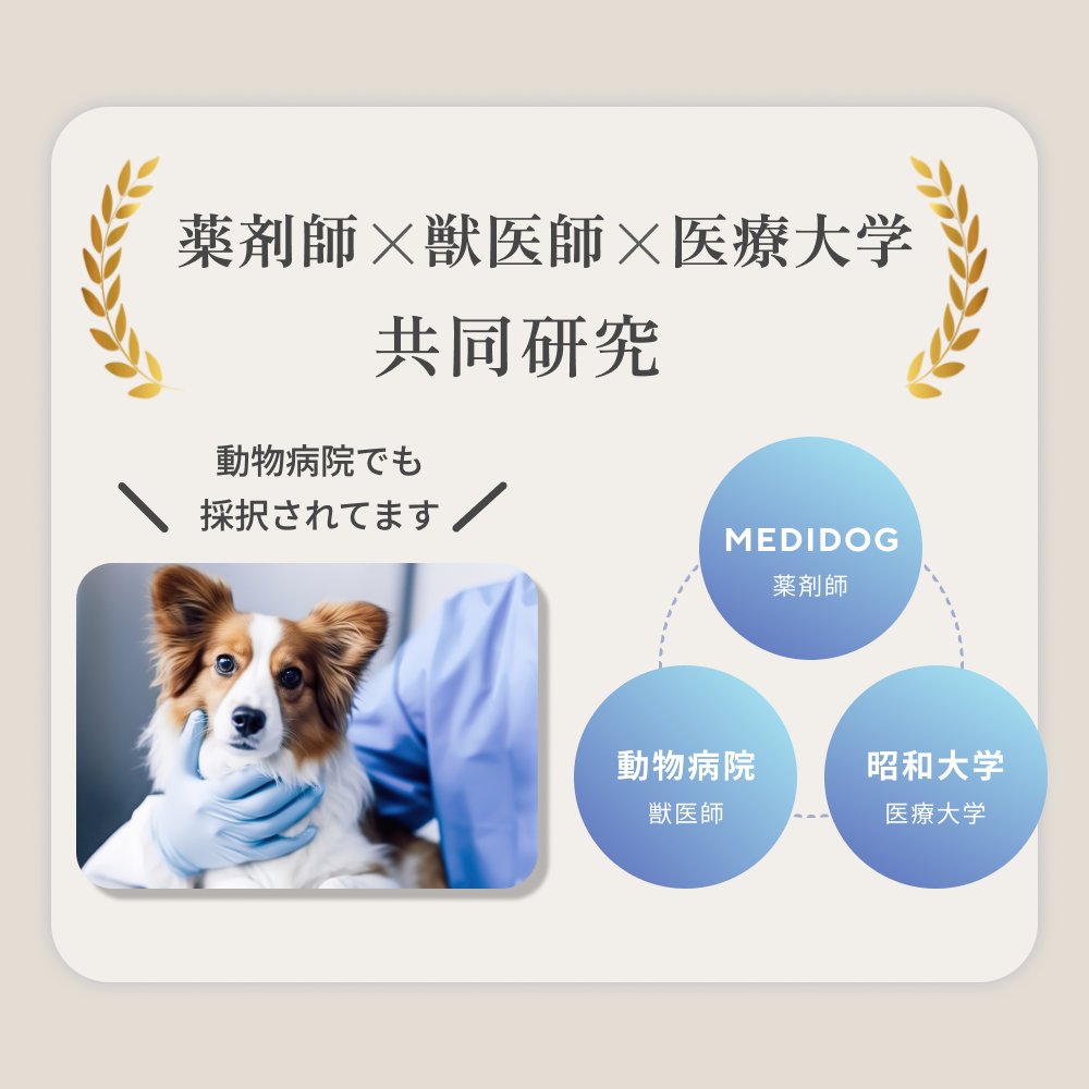 「薬剤師×獣医師×医療大学」という産学医連携体制にて、犬を医学的目線で研究し、確かなエビデンスのもと研究開発をしております。