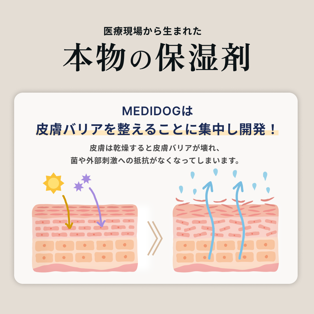 「MEDIDOG」は、肌の負担になる成分を配合せずに、高い保湿力で皮膚バリアを整える成分設計にしました。