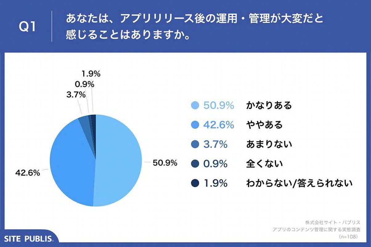 商用CMSおよびWeb関連サービス・製品の企画・開発・販売などを手がける株式会社サイト・パブリス(本社:東京都千代田区、代表取締役:二通 宏久、https://www.sitepublis.net/)は、スマートフォン向けのアプリを提供している企業の開発/運用担当者108名を対象に、アプリのコンテンツ管理に関する実態調査を実施しましたので、お知らせいたします。