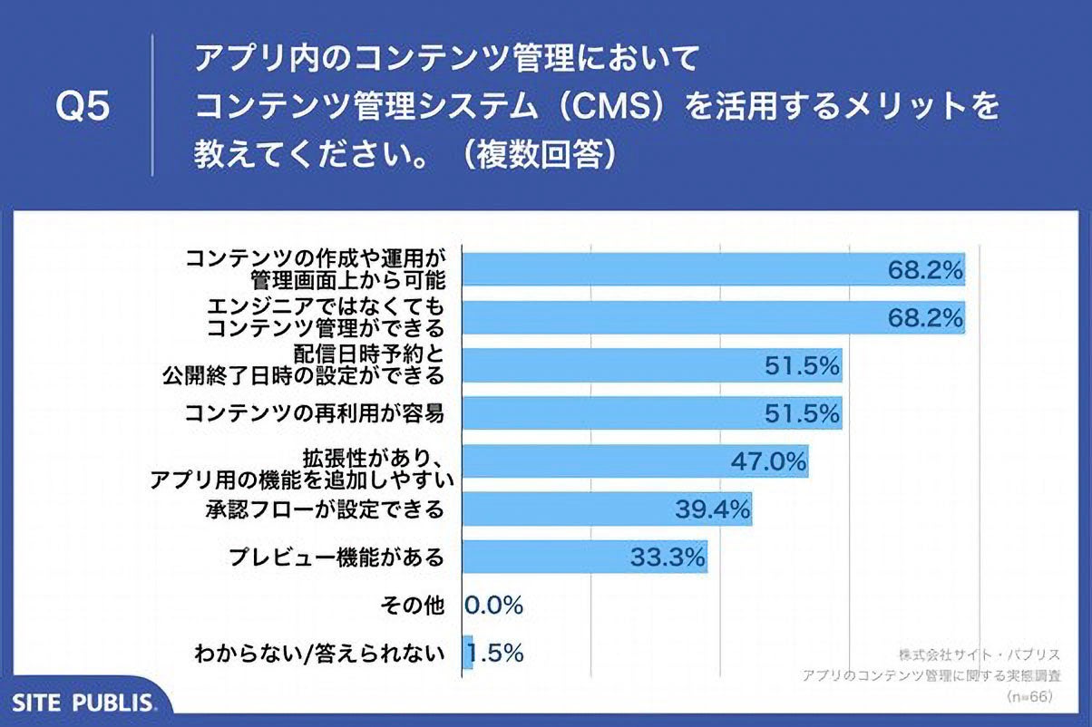 「活用している」と回答した方に、「アプリ内のコンテンツ管理においてコンテンツ管理システム(CMS)を活用するメリットを教えてください。(複数回答)」と質問したところ、「コンテンツの作成や運用が管理画面上から可能」が68.2%、「エンジニアではなくてもコンテンツ管理ができる」が68.2%、「配信日時予約と公開終了日時の設定ができる」が51.5%という回答となりました。