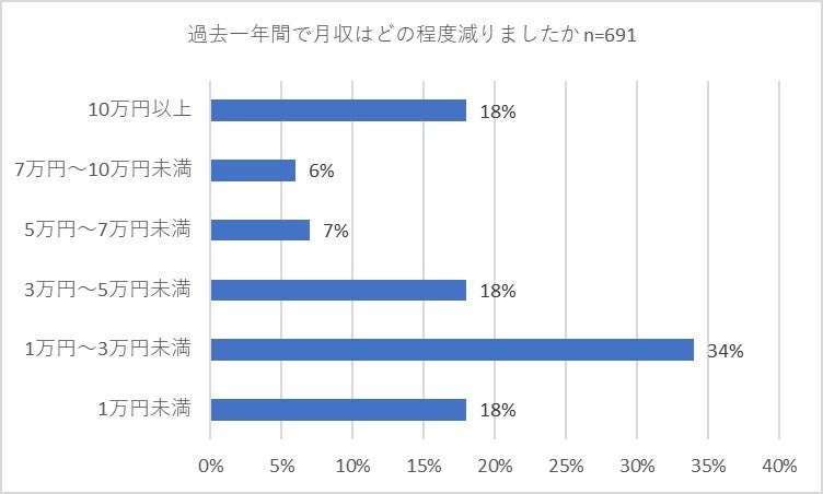次に前設問で月収が「減った」と回答した691人に対し、「過去一年間で月収はどの程度減りましたか」との質問を行いました。その結果、「1万円~3万円未満」が34パーセントで最も多くの回答を集めました。2位には「1万円未満」、「3万円~5万円未満」、「10万円以上」がともに18パーセントで並びました。