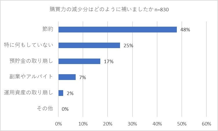 続けて、購買力が「減った」と回答した830人に「購買力の減少分はどのように補いましたか」と尋ねたところ、ほぼ5割の方が「節約」(48パーセント)と回答。以下、「特に何もしていない」(25パーセント)、「預貯金の取り崩し」(17パーセント)が続きました。