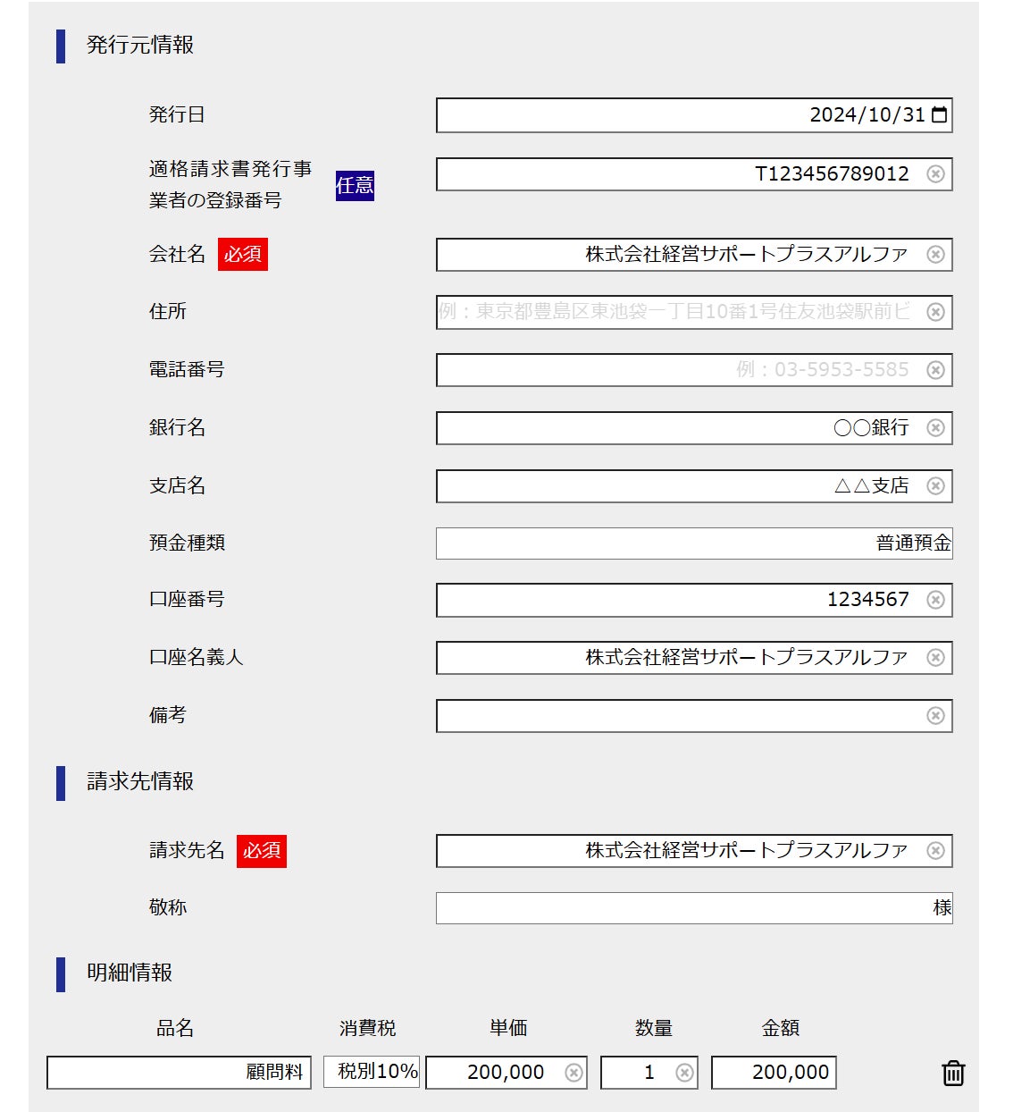 ツールの利用時は、請求金額および請求者や請求先に関する情報を入力するだけです。