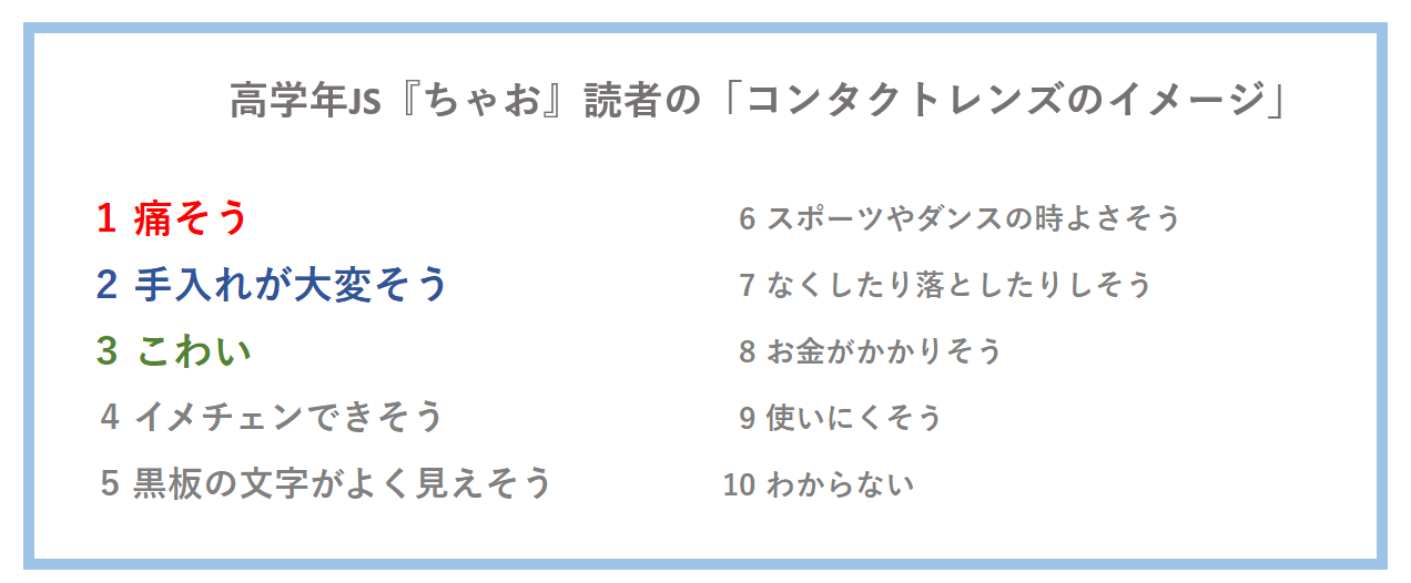 コンタクトレンズのイメ―ジに関する質問では、「痛そう」「こわい」という回答も多く、目の中にコンタクトレンズを入れることに抵抗を感じているJSがいる一方で、「イメチェンできそう」「スポーツやダンスのときによさそう」というポジティブな意見もランクインしています。イマドキJSたちは、おしゃれやメイク、ダンスへの関心も高いので、コンタクトレンズへ興味関心を持っている子たちも少なからずいそうです。