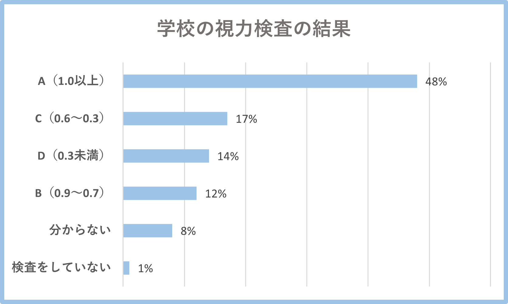 学校の視力検査の結果を見てみると、半数がA判定、半数がA判定以外と回答しています。メガネやコンタクトレンズで視力補正しているJSもいれば、条件や環境によっては、学校生活や黒板の文字に見えにくさを感じている子がいるかもしれません。