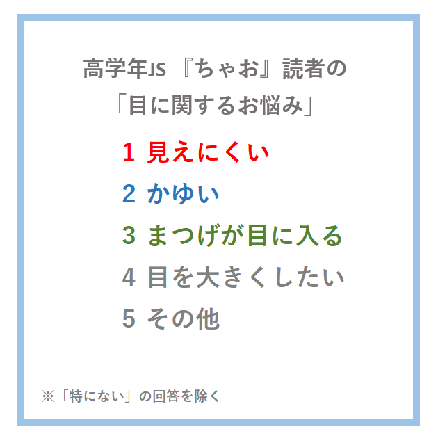 今回は『ちゃお』2023年9月号で掲載、収集した「視力」や「目」に関するアンケート結果を発表いたします。学校の視力検査結果や、目に関するお悩み、コンタクトレンズに関するイメージなど、イマドキJSのリアルな実態を公開します。
